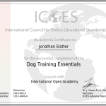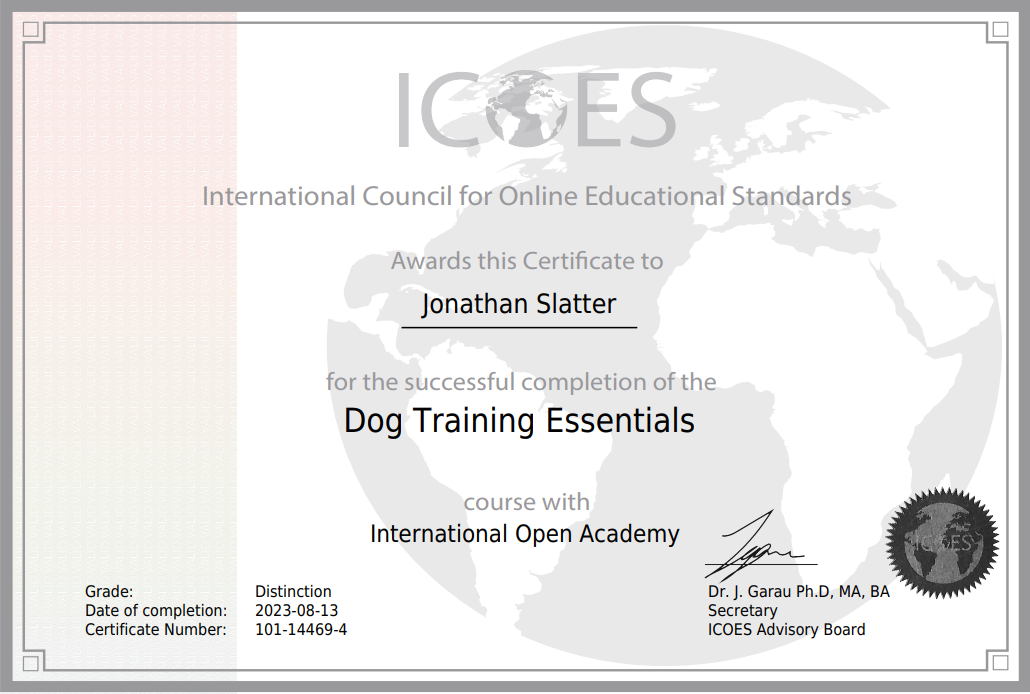 Completed with Distinction ICOES Dog Training Essentials with International Open Academy 2023.