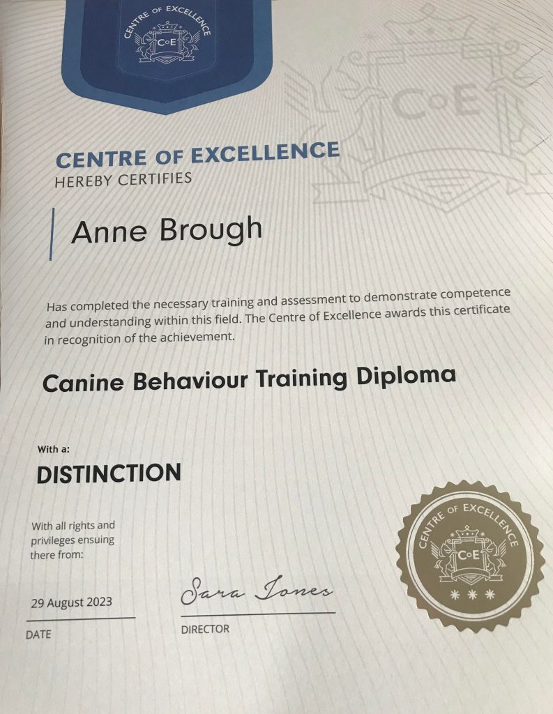 Qualifications: Canine Behaviour Training Diploma (Distinction) – Centre of Excellence